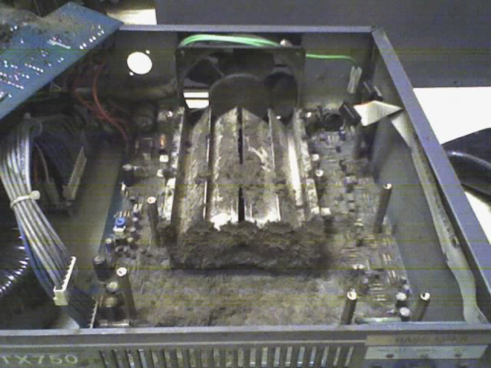 While we do not recommend that anyone open their amplifiers to clean them, a jet of compressed air into the vent slots of the front of an amplifier can certainly clean off the serious accumulation of dust and dirt seen above. We recently completed a service call to an arena that advised that the sound cut out after the system had been used for about an hour. We discovered an even worse scenario than the above picture. We had installed the two amplifiers 17 years ago, but they had never even once been serviced. One amplifier was beyond repair due to the heat damage, but the second was cleaned and is still working today.